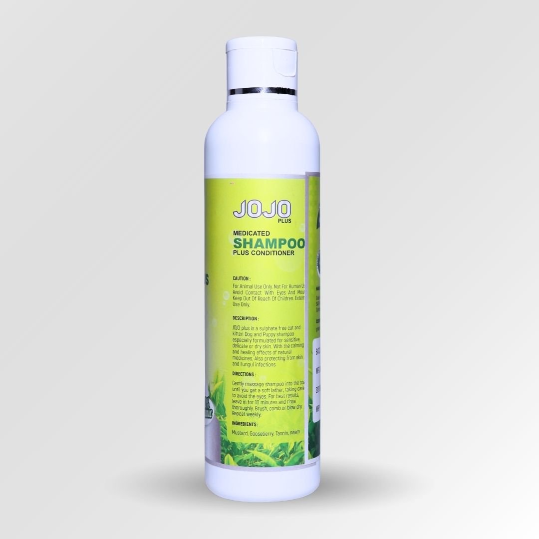 Green Mountains JOJO Plus Medicated Shampoo + Conditioner is a gentle, sulfate-free grooming solution for dogs and cats with sensitive skin. Formulated with naturally derived ingredients, it cleanses, conditions, and helps soothe skin while supporting protection against common skin and fungal concerns. Leaves the coat soft, fresh, and easy to manage with a mild tea tree fragrance.